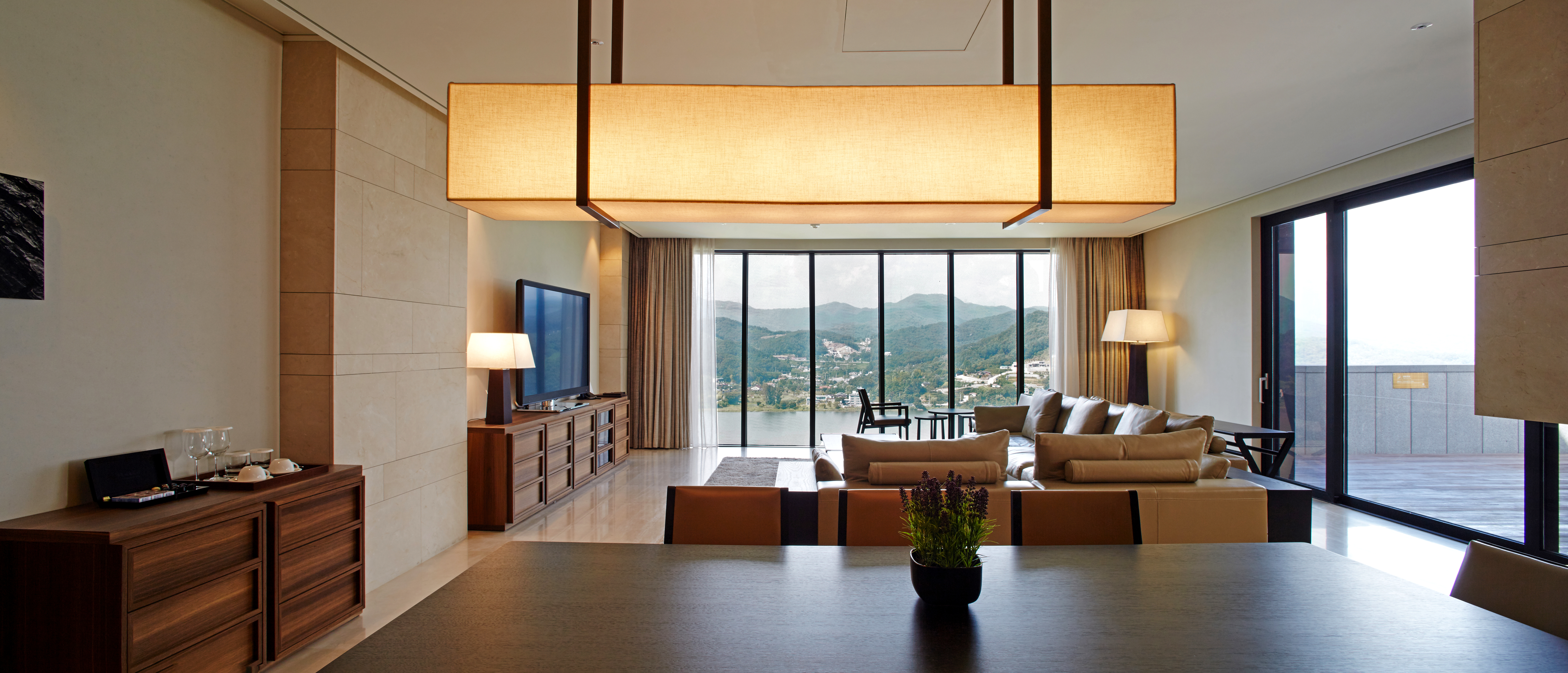 비즈니스 스위트 객실은 동양의 전통적인 디자인과 서양의 입식 문화를 결합한 콘셉트를 가지고 있는 객실입니다. 고급 마감재를 사용한 창문을 열었을 때 보이는 문창살 넘어로 보이는 자연 경관이 동양의 품격을 더해주며, 서양적인 가구들의 생활의 편리함을 더해줍니다.