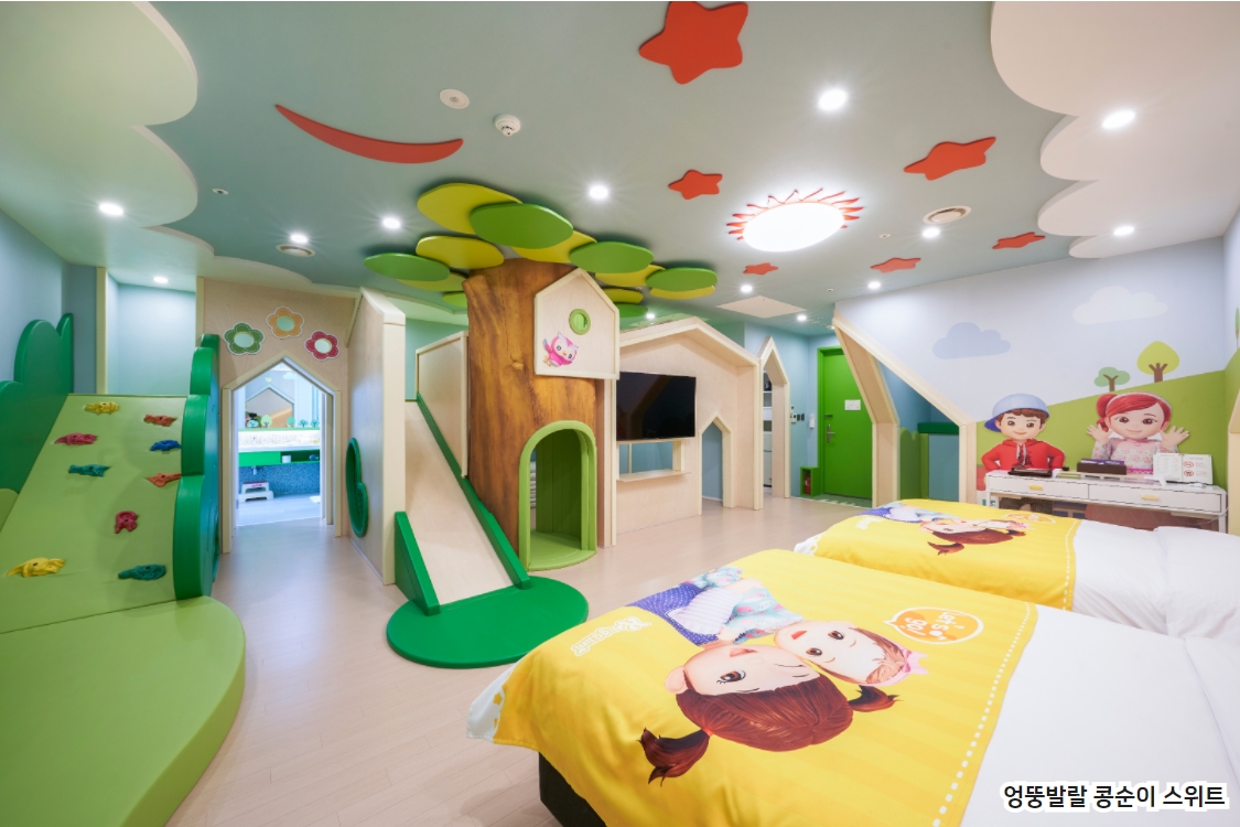 아이가 좋아하는 애니메이션에 따라 객실 타입 선택이 가능하며, 미끄럼틀, 트램펄린 등 아이들이 좋아할 만한 요소들이 곳곳에 숨겨져 있습니다. 층간 소음 걱정 없이 마음껏 뛰어놀 수 있어 아이와 보호자들로부터 많은 사랑을 받고 있는 객실이에요. 일주일에 한 번 아이가 신나게 뛰어놀 수 있는 좋은 추억을 선물해 주시는 것은 어떠신가요?