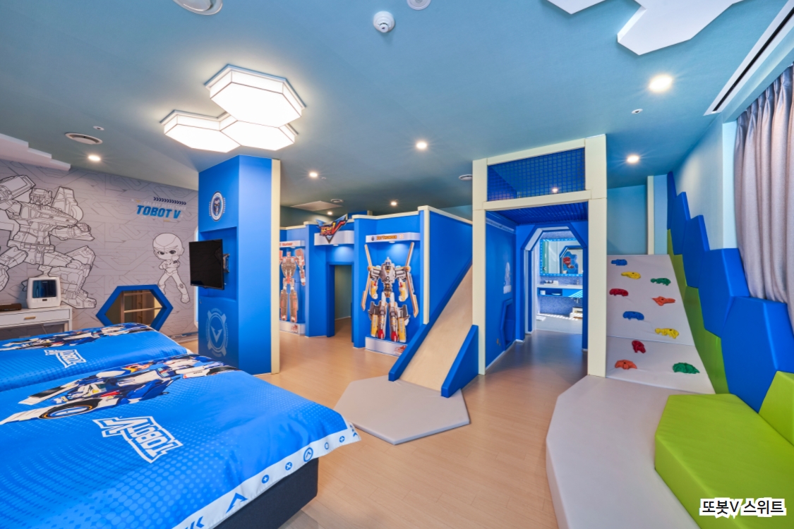 블룸비스타 호텔에는 시크릿 쥬쥬뿐만 아니라 아이들로부터 많은 사랑을 받고 있는 캐릭터 '또봇 V'와 '엉뚱 발랄 콩순이' 객실도 보유하고 있습니다. '또봇 V'는 아빠가 좋아하는 자동차 장난감이 로봇으로 변신하는 내용의 애니메이션인데요. 자동차를 좋아하는 아이들 모두에게는 꿈같은 하루를 보낼 수 있는 객실로 인기가 많습니다.