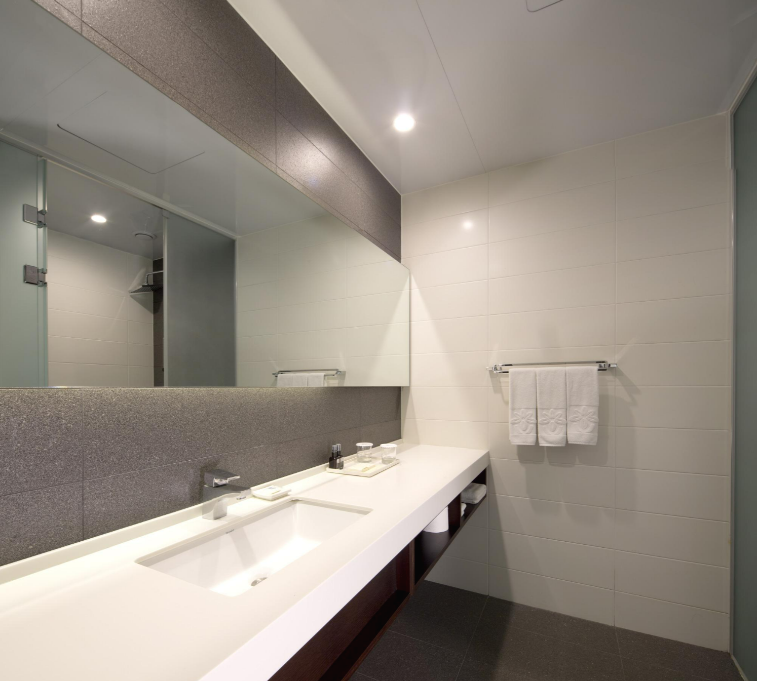 다양한 물건을 올려놓기에도, 성인 2인이 함께 사용하기에도 넉넉한 규모의 욕실