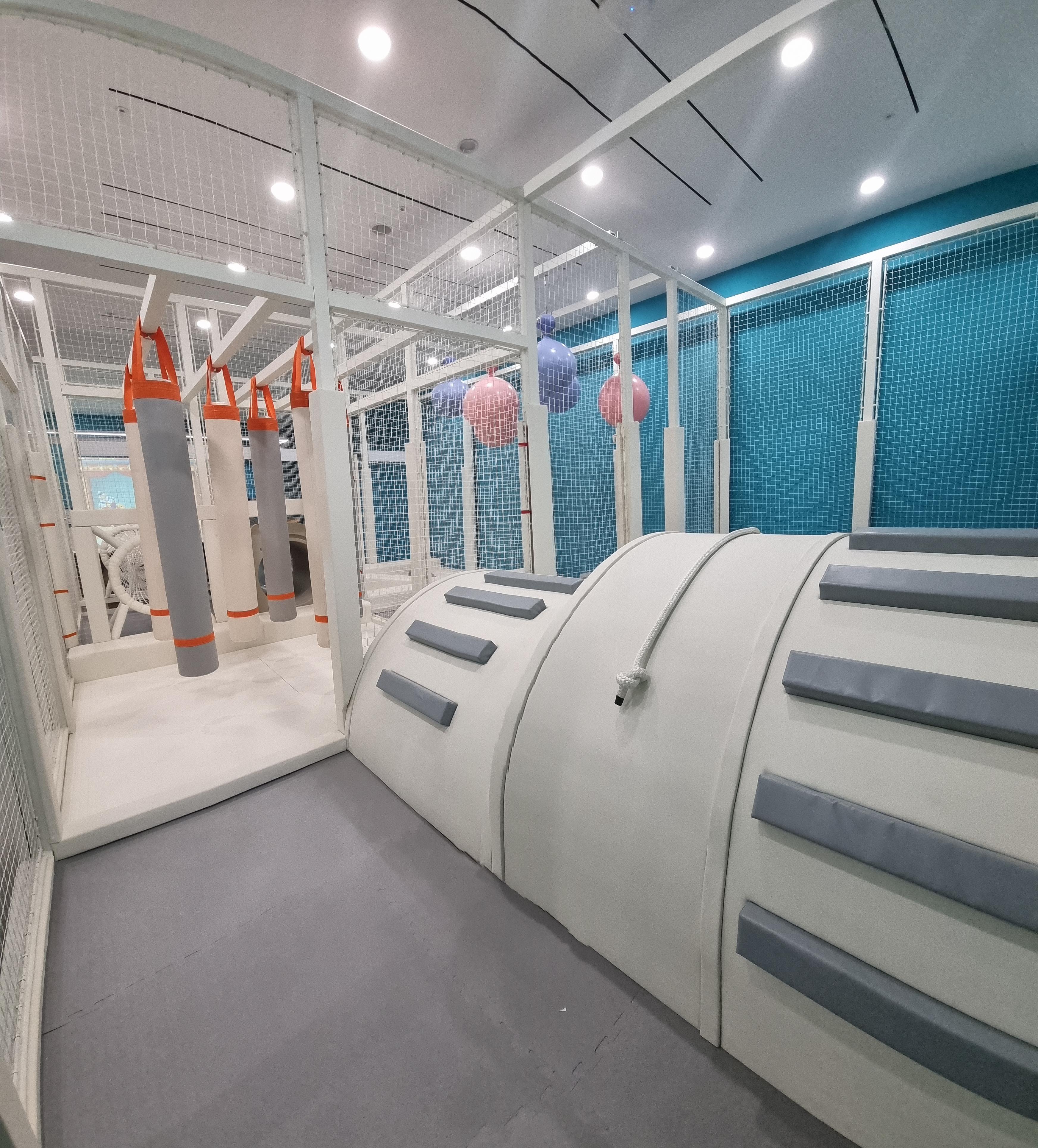 국내 최고의 키즈공간 전문가들이 참여해 만든 '플레이존'은 아이들의 안전을 우선으로 설계되었습니다. 플레이존에는 모션 슬라이드, 모션 슈팅, 원형 튜브, 챌린지 코스, 트램펄린 러너, 폼핏 그라운드 등 다채로운 놀이기구들로 구성되어 있는데요. 플레이존 안으로 들어서면 아이들의 심신 안정에 도움을 주는 블루 계열과 화이트 계열의 인테리어가 안정감과 편안함을 더했습니다. 또한, 아이들의 도전의식을 부르는 챌린지 코스는 또 다른 재미를 선사합니다.