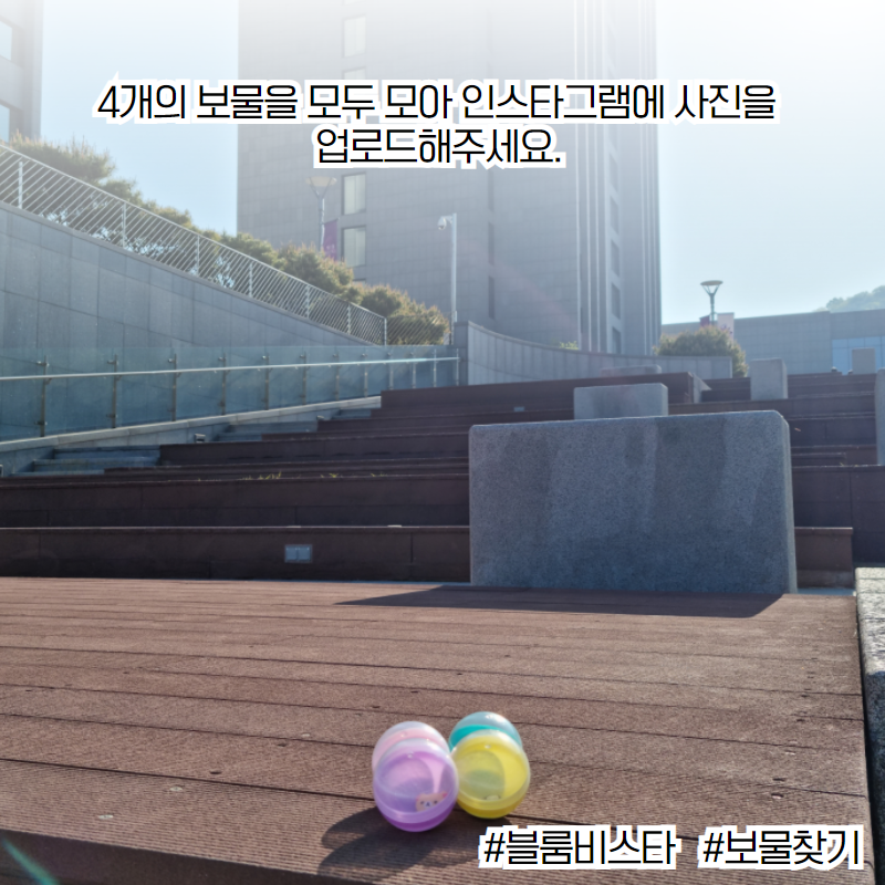 보물찾기 게임은 블룸비스타 호텔 공식 인스타그램 계정 (@bloomvista_official)에 올라온 보물찾기 지도와 참여방법을 보고 참여하는 게임이었습니다. 5월 5일부터 7일까지 매일 12시와 16시부터 한 시간 동안 블룸비스타 인스타그램 계정을 통해 지도와 참여 방법이 업로드되었는데요. 서로 색이 다른 공 4 개를 모두 모아 사진을 찍고 해시태그와 함께 인스타그램에 사진을 업로드하여 경품을 수령해가셨습니다.