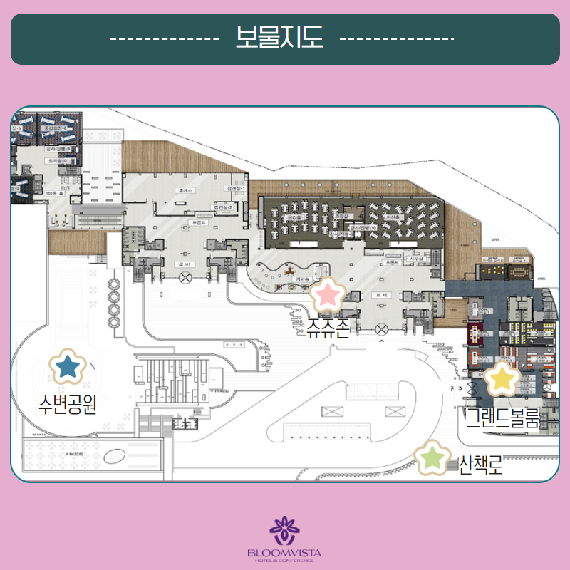 D동 2층에 위치한 그랜드볼룸, C동 3층에 위치한 쥬쥬존 등 호텔 곳곳을 걸으며 구경하고 블룸비스타 호텔을 더욱 자세히 볼 수 있는 시간을 가졌습니다.