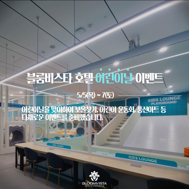 블룸비스타 호텔은 5월 가정의 달을 맞이하여 그랜드 오픈한 키즈라운지와 어린이날을 기념하기 위해 5월 5일부터 7일까지 3일간 온 가족이 함께 참여할 수 있는 이벤트 '보물찾기'와 '어린이 운동회'를 진행했습니다. 3일 동안 400여 가족이 보물 찾기에 참여해주셨고, 100여 가족이 어린이 운동회에 참여해주셨는데요. 운동회에 참여하여 메달을 획득하신 팀은 물론 경기에 열심히 참여하신 모든 분들께 소정의 경품을 지급해드렸습니다.