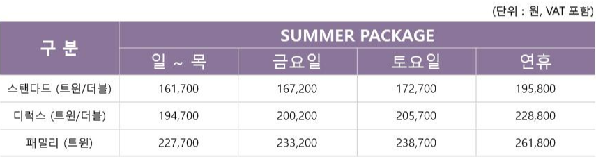 - 특정일 : 현충일(6/4~5) 연휴 요금, 광복절(8/14) 토요일 요금 적용