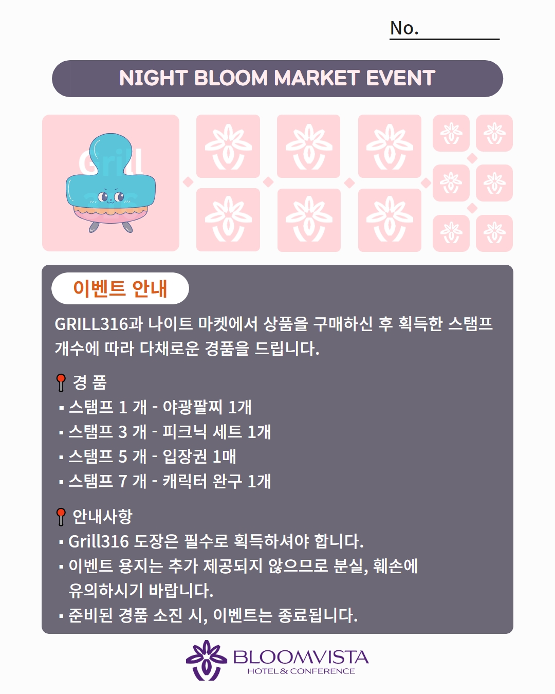 BBQ 플래터를 즐길 수 있는 Grill316에 방문해 저녁식사를 하고 야시장(플리마켓)에서 상품을 구매하신 고객에게 경품을 드리는 현장 이벤트 '스탬프투어'를 진행중입니다. 경품은 스탬프 개수에 따라 다르며, 피크닉 세트 부터 캐릭터 장난감까지 다채로운 경품을 준비하였습니다.