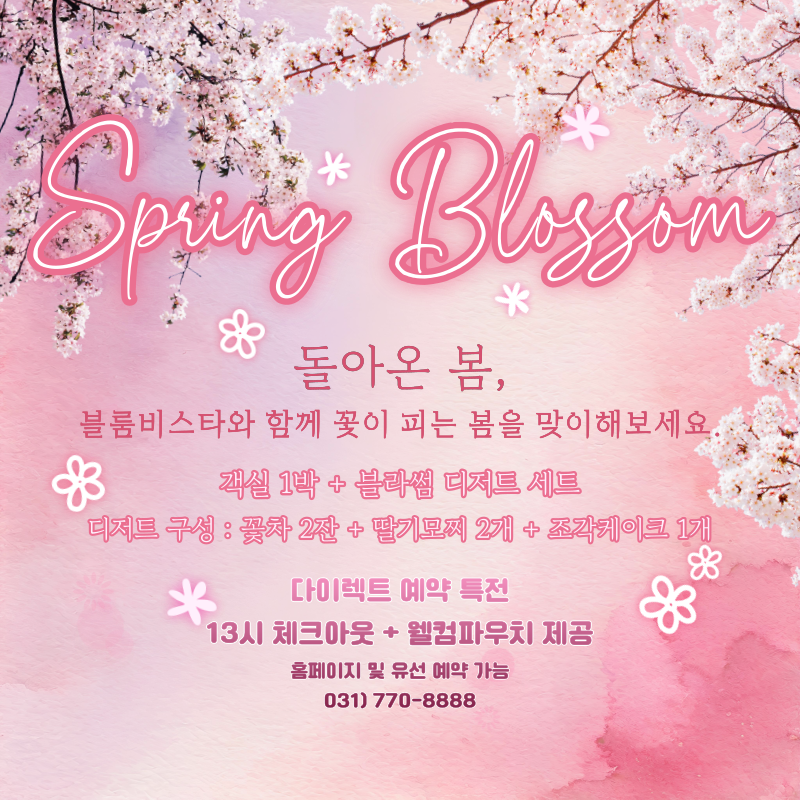 봄의 따스함과 함께 블룸비스타에서 특별한 순간을 만들어보세요. 예약은 언제든지 가능하니, 지금 바로 호텔로 문의해 보세요!😊