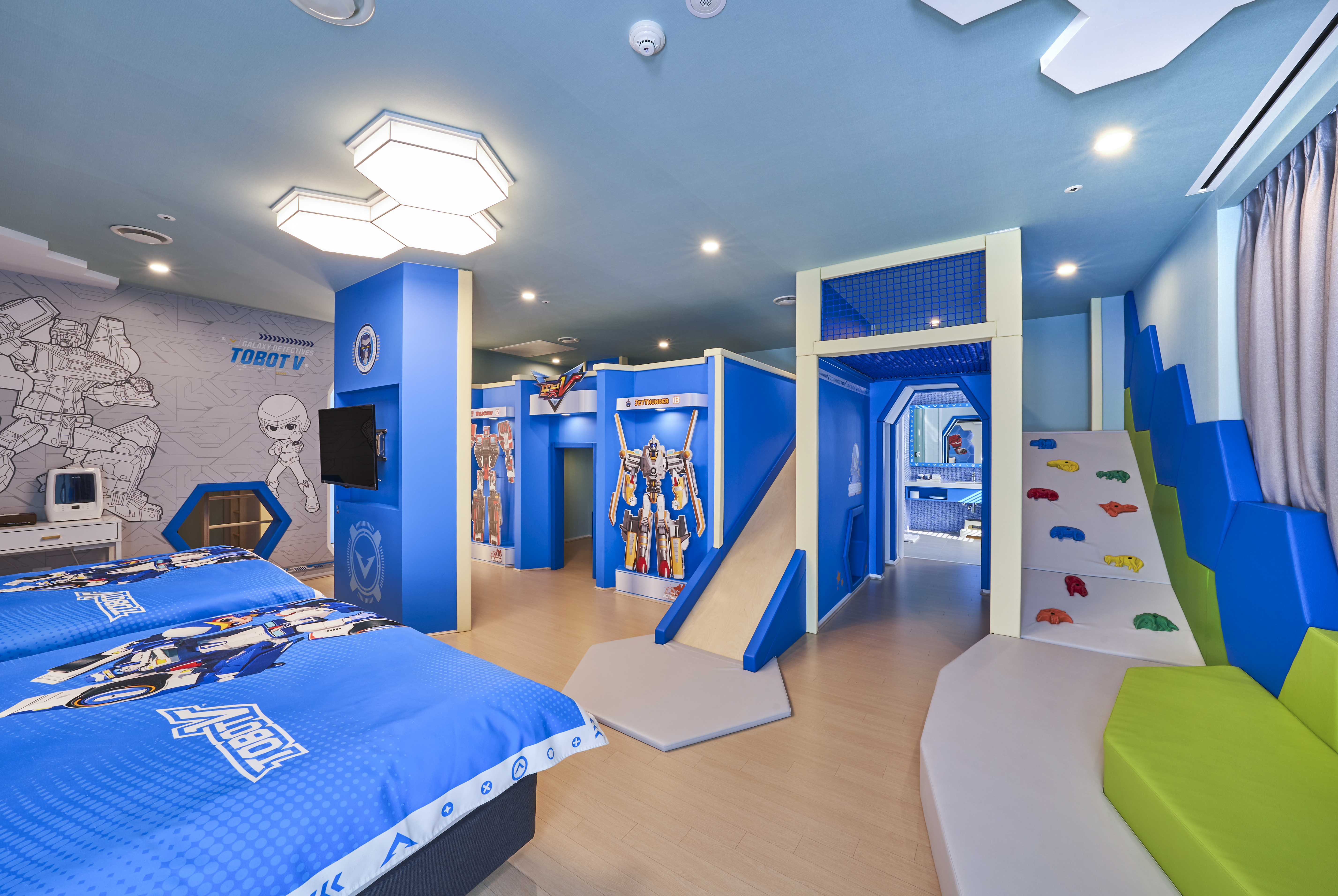 블룸비스타 호텔에는 시크릿쥬쥬뿐만 아니라 아이들로부터 많은 사랑을 받고 있는 캐릭터 '또봇V' 와 '엉뚱 발랄 콩순이' 객실도 보유하고 있습니다. '또봇V'는 아빠가 좋아하는 자동차 장난감이 로봇으로 변신하는 내용의 애니메이션인데요. 자동차를 좋아하는 아이들 모두에게는 꿈같은 하루를 보낼 수 있는 객실로 인기가 많습니다.