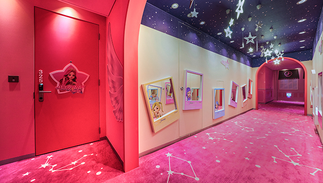11명의 여신과 함께 사진을 찍을 수 있는 복도는 아이들이 객실로 들어가기 전 무조건 멈춰서 사진을 찍는 포토존입니다. 특히 천장에 달린 별 조명들이 이 공간을 더욱 특별하게 만들어주어 아이의 인생 최고의 모습을 찍으실 수 있습니다. 아이가 좋아하는 캐릭터 앞에서 추억 한 장 남겨주시는 것은 어떠신가요?